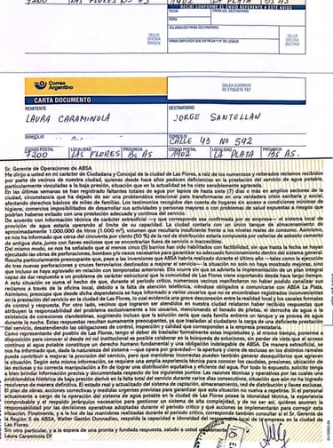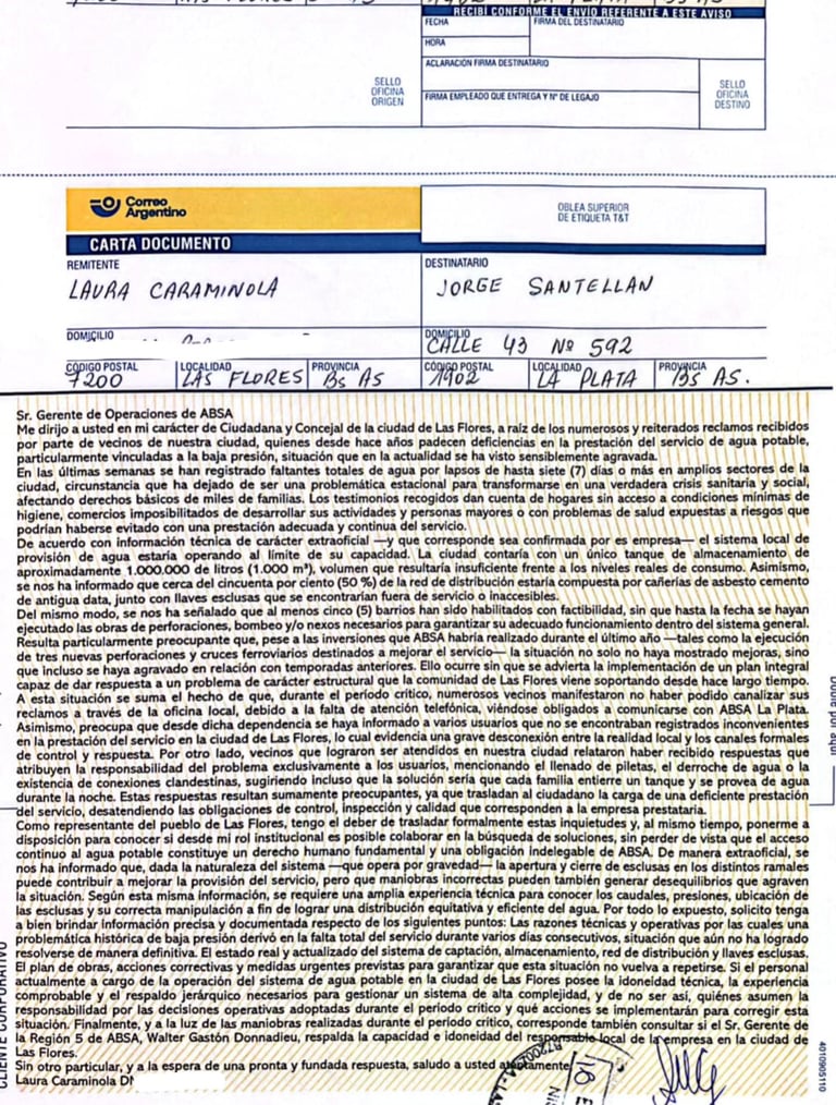 El Bloque político La Libertad Avanza Las Flores envió recientemente una carta documento a ABSA, exigiendo soluciones inmediatas frente a los problemas de suministro y servicio de agua que afectan a numerosos vecinos del partido.